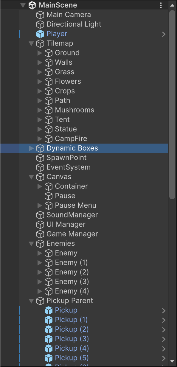 - Clear UI: Start scene, collected PickUps, countdown timer, pause menu, and Skill buttons.